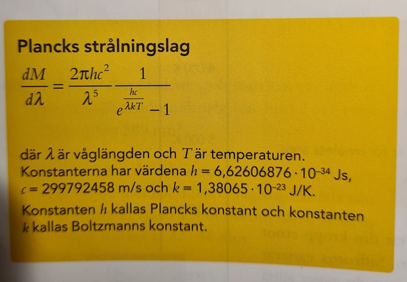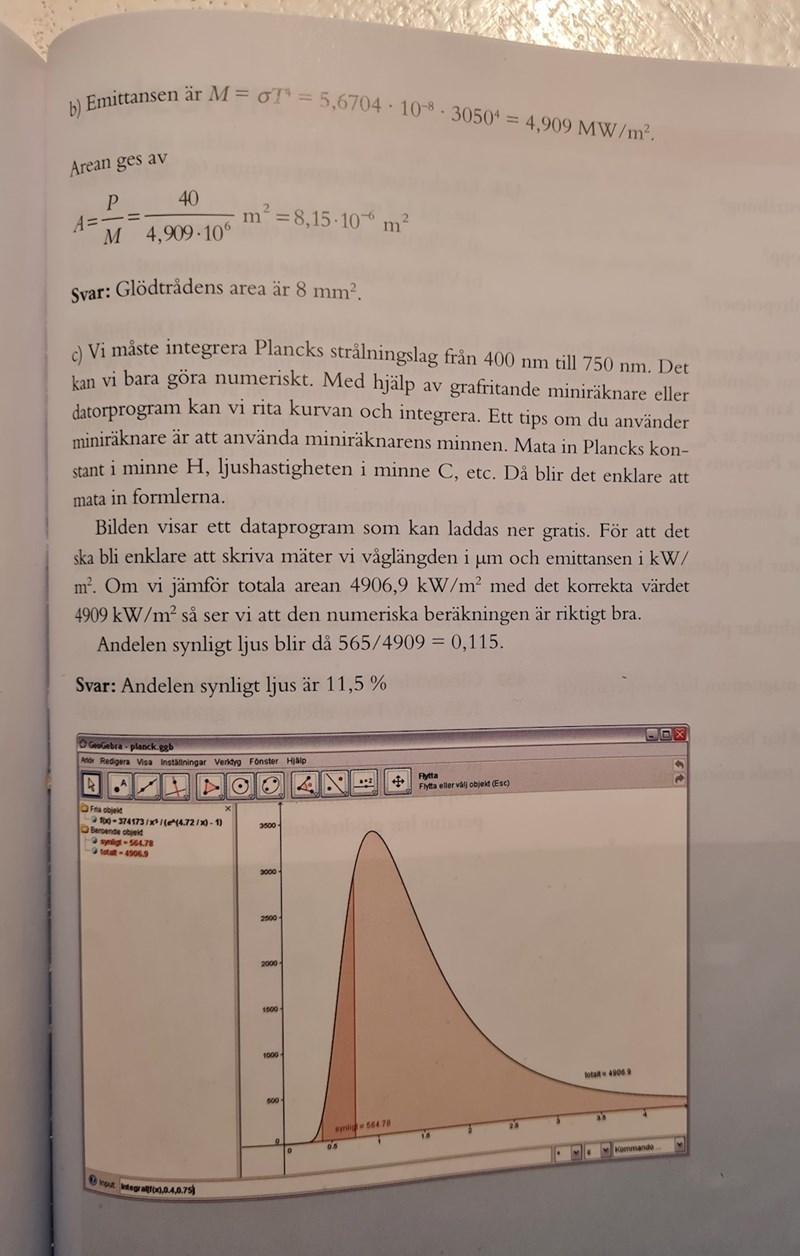 Använder man Stefan-Boltzmanns lag får man den exakta arean som är 4,9 MW/m^2. Andelen synligt ljus är 565 kW/m^2 och detta är 11,5% av hela grafens area, exakt som i exemplet.