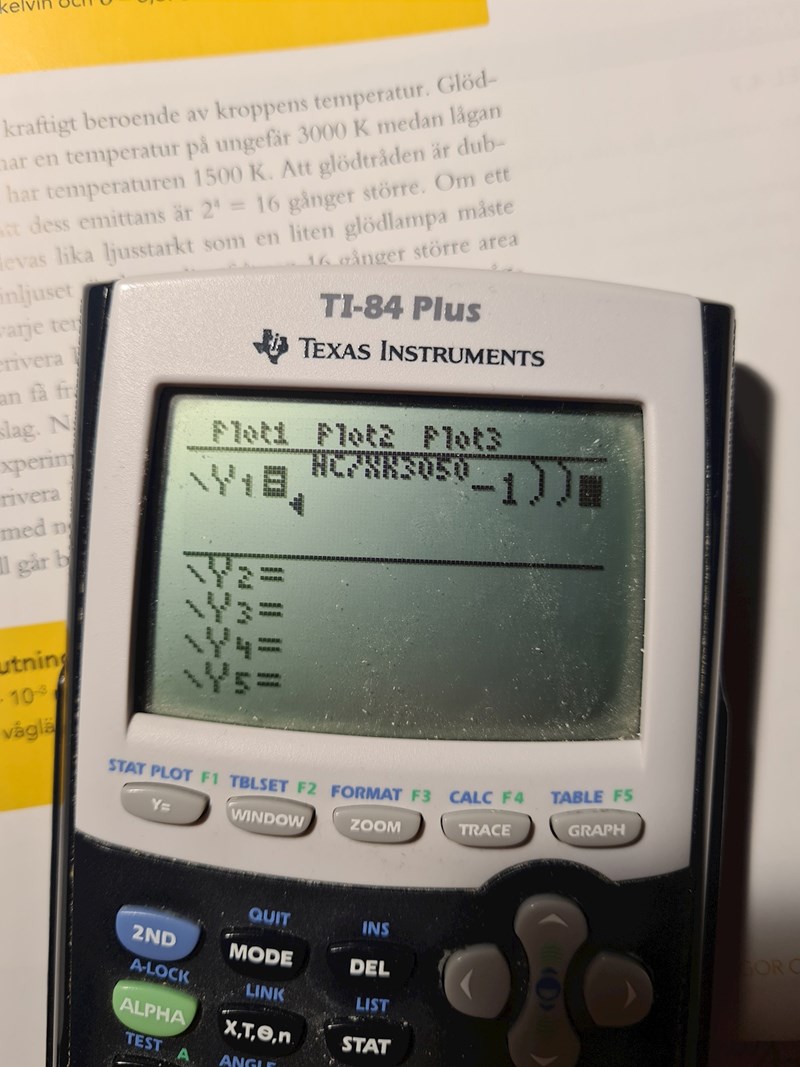 Funktionen blir 2pihc^2/x^5 × 1/ (e^(hc/xkT)-1) I mitt fall blir T=3050 K eftersom lampans glödtråd har den temperaturen.