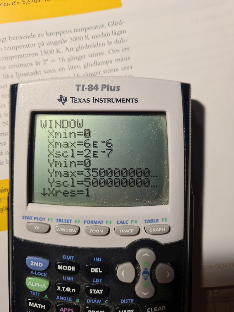 Tankar Angående miniräknaren. Så borde xmin= 400nm & xmax=750nm, ymin borde rimligtvis vara =0 och ymax = lite över det M-värdet(Emittansen) man får ut.