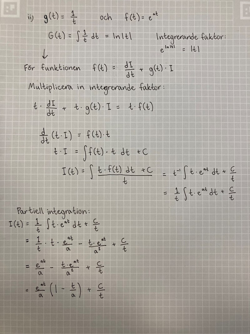 Hej! Sitter med en uppgift i ellära men fastnar i uträkningarna. Har fått lite hjälp av min vän som har använt sig av en integrerande faktor och fått fram integralen I(t) = t · eat dt + . Fram till det steget är jag med men hon har sedan fått det till att bli I(t) = t · - .