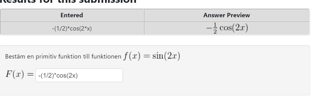 Fick rätt svar när jag svarade: -(cos(2x))/2. Som du sa så verkade det inte förstå att det som jag svarade var samma med skrivet på ett annat sätt.