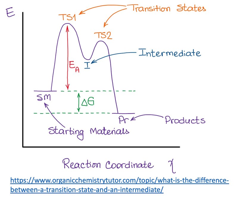 Längs X-axeln är reaktionens gång, från reaktant till produkt, och y-axeln visar hur hög energin är under denna gång. Så under reaktionen ökar energin till första övergångstillståndet (transition state på engelska), sedan minskar energin genom att intermediären bildas. Sedan ökar energin igen till det andra övergångstillståndet. (Och denna reaktion kan ske spontant då produktbildningen frigör energi, positivt delta G).