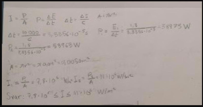 Fråga: En radiostation sänder ut vågor som kan transportera energi mellan 1,3 J och 1,8 J. Efter 10 km träffar vågen ett cirkulärt föremål med radien 4 cm. Hur stor är intensiteten på det cirkulära föremålet?