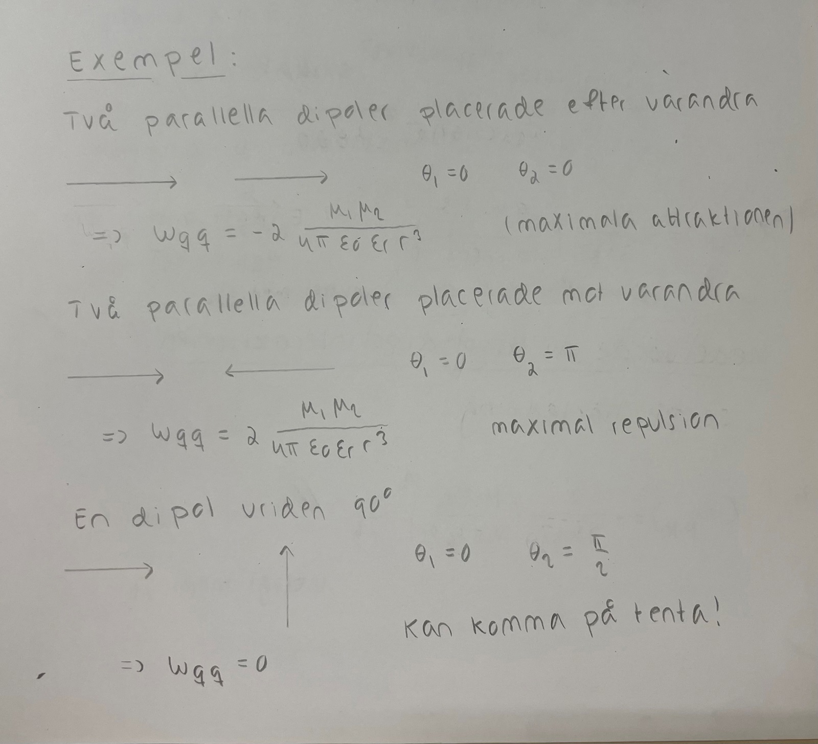 Vi har tidigare t.ex. beräknat interaktioner mellan dipoler och härlett hur man får fram maximala repulsion och maximala attraktionen. Se nedan