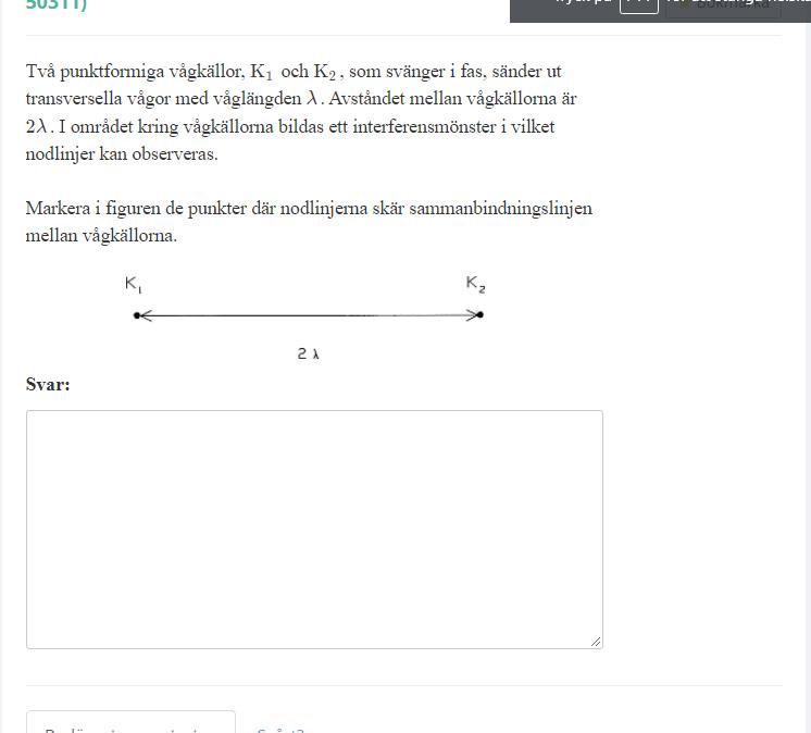 Det är riktigt. Men eftersom nodlinjerna ska sammanfalla med nollsvängning på linjen mellan K1och K2 kan man rita upp vågen mellan källorna. Då avståndet mellan källorna är två våglängder så hur många gånger skär vågen linjen mellan källorna?
