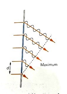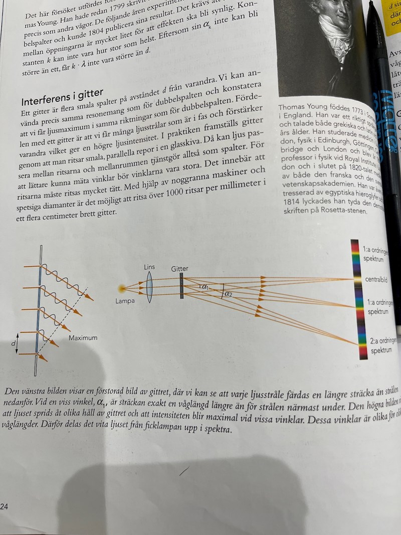Gitteravståndet d är markerat, och du kan hitta våglängden lambda och vinkeln a. Sambanden har du redan skrivit upp, och det gäller att se dem i bilden också.