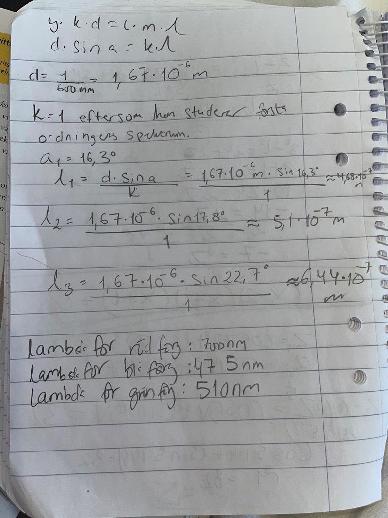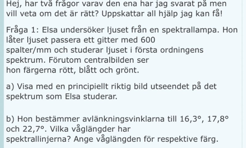 Vinklarna för färgerna har du fått, så du kan räkna ut våglängderna. Vilken som är röd/blå/grön kanske du redan kan, eller kan hitta någonstans.
