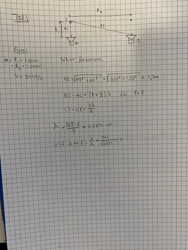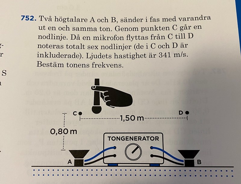 För det första tycker jag att uppställningen i uppgiften är dålig. När punkt C ligger drygt två gånger så långt från B än från A är ljudintensiteten över fyra gånger svagare (minst: tongeneratorn står i vägen, hogtalarens kon sänder mest framåt). Då finns inga tydliga noder.