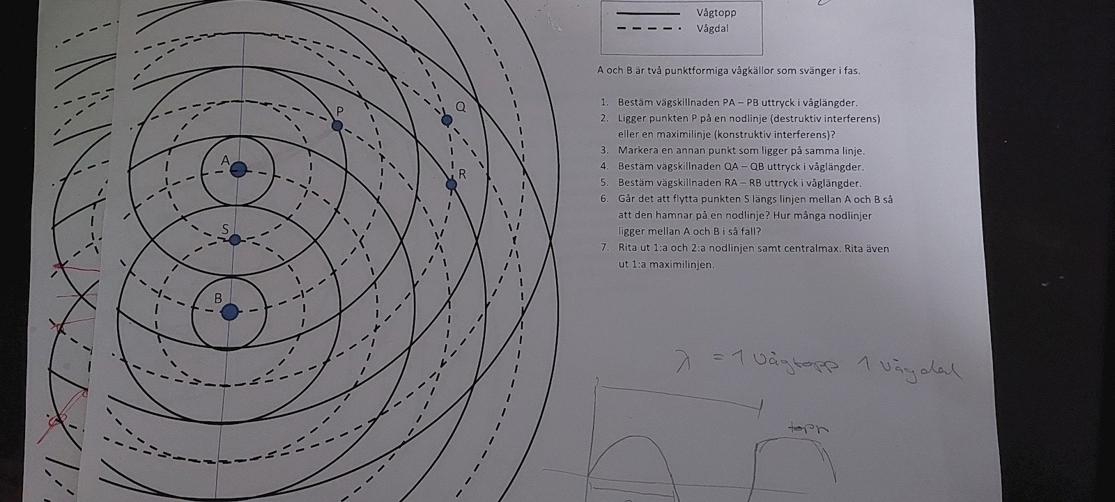 Hej! Jag vet inte riktigt hur jag ska ta mig an första frågan som söker vägskillnaden mellan PA och PB (uttryckt i våglängder). Jag tror att om jag får hjälp med första, kommer jag få en klarare bild kring hur jag läser av våglängderna i bilden och kan därför fortsätta med resten på egen hand. Tack för förhand!