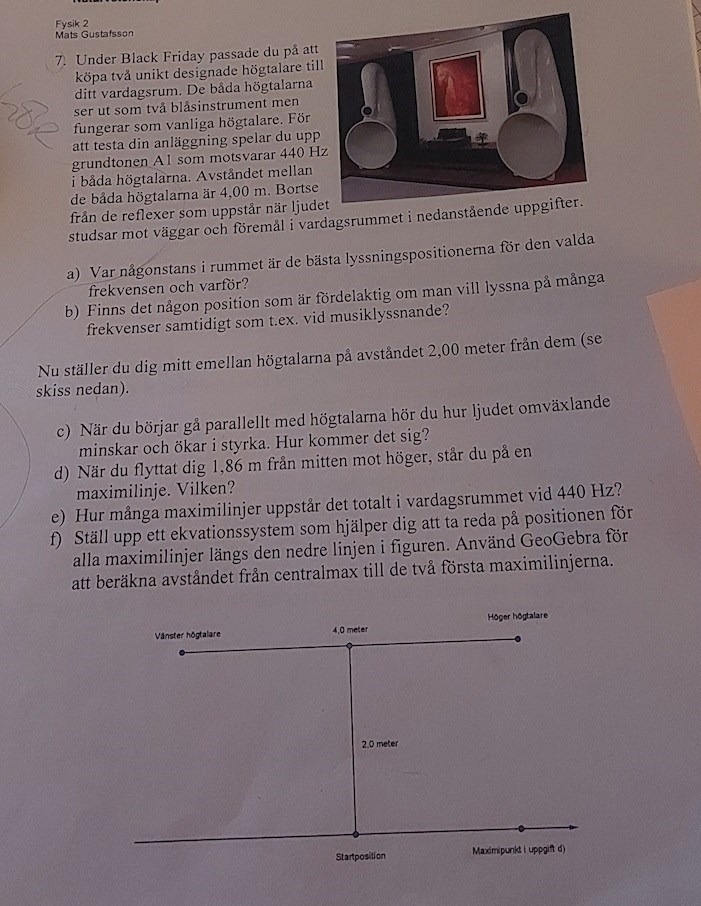 Hej! Jag har fastnat på c) uppgiften. Jag tänkte att parallellt med vågkällorna innebär att jag går längs centralmax. Däremot är det bara konstruktiv interferens där, alltså kan inte ljudstyrkan minska längs den vägen...? Tack på förhand!