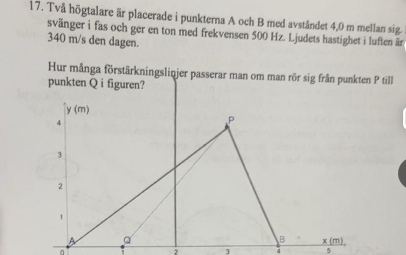 Jag har en tanke om hur jag ska gå till väga men samtidigt känner jag mig osäker. Jag tänkte först kolla hur många Maxima jag korsar från Q till centralmax genom att ta deras vägskillnad vid Q som är 2 meter och få fram ett k värde som är cirka 2.9, alltså finns det två maxima mellan Q och centralmax, med våglängd på 0.68 meter. då borde man väl passera 2 st ljudmax fram till centralmax, eller tänker jag fel?
