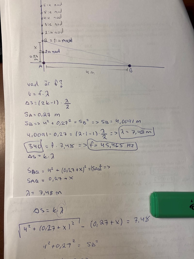 vågorna från A och B förstärker varandra maximalt, därefter korsar man så småningom ytterligare totalt fem nodlinjer. Inga fler noder finns utefter L.
