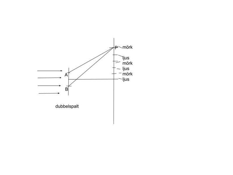 Figuren visar en dubbelspalt AB med avståndet 0,10 mm som belyser med laserljus med våglängden 633 m. På en vägg erhåller man ett interferensmönster bestående AB omväxlande ljus och mörka områden. Hur stor är vägskillnaden PB-PA?