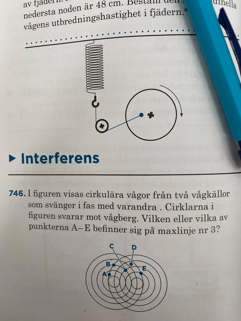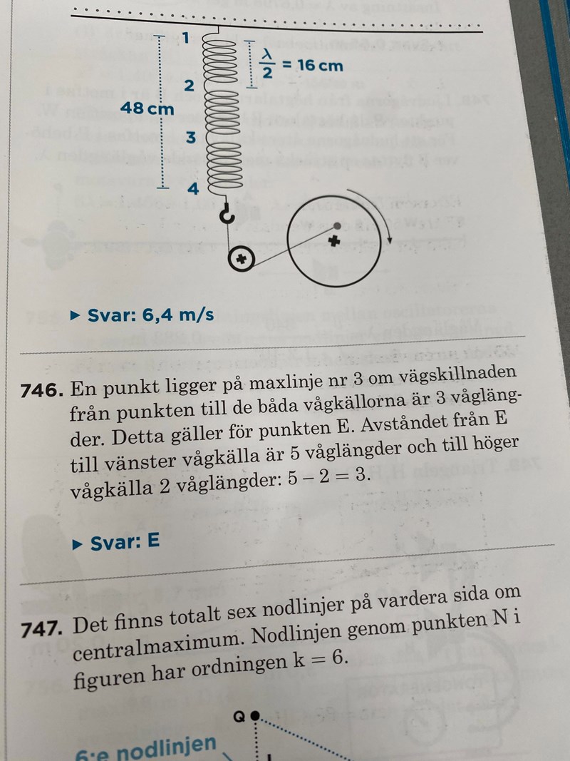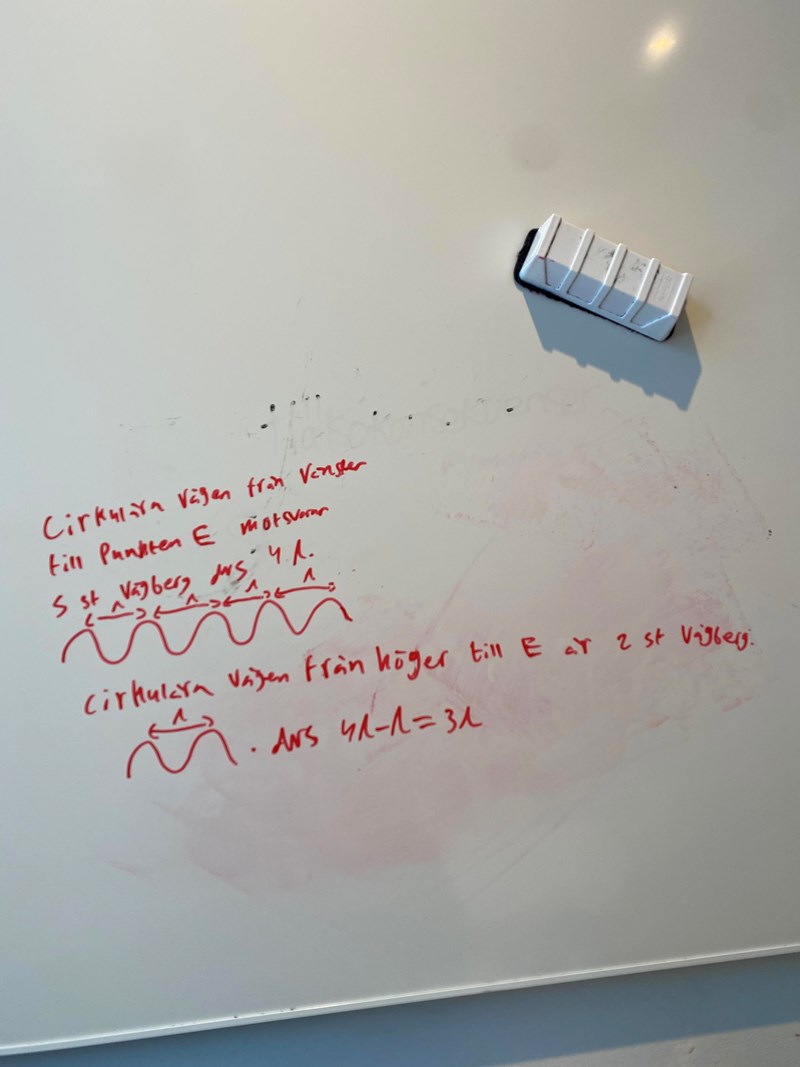 Att ”avståndet från E till vänster vågkälla är 5 våglängder och till höger vågkälla 2 våglängder”