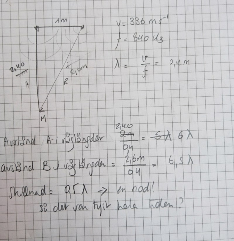 Om man flyttar sig från M 0.5 m åt höger i bild så blir vägskillnaden 0 och interferensen blir maximalt konstruktiv.