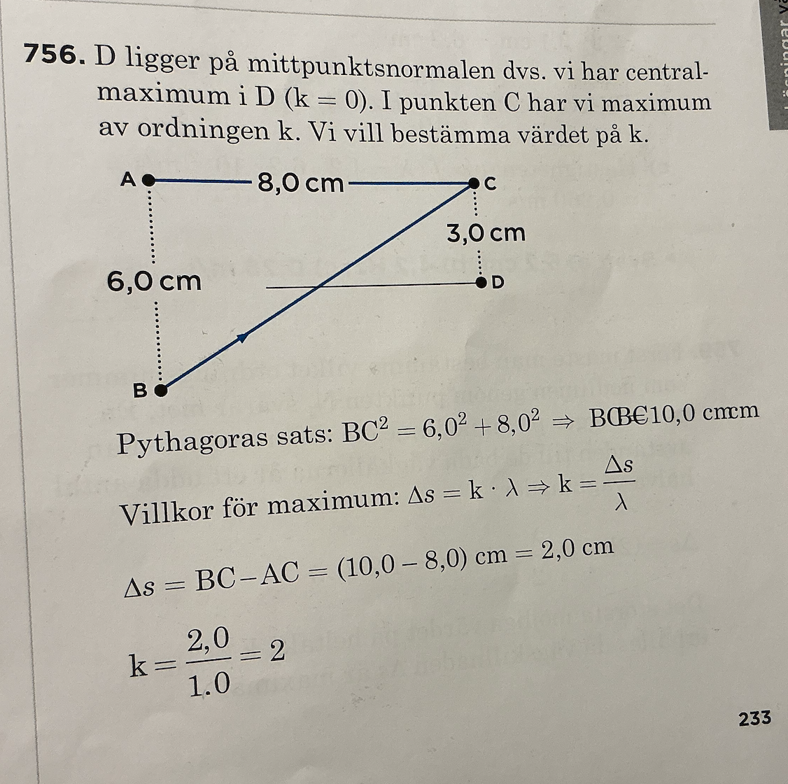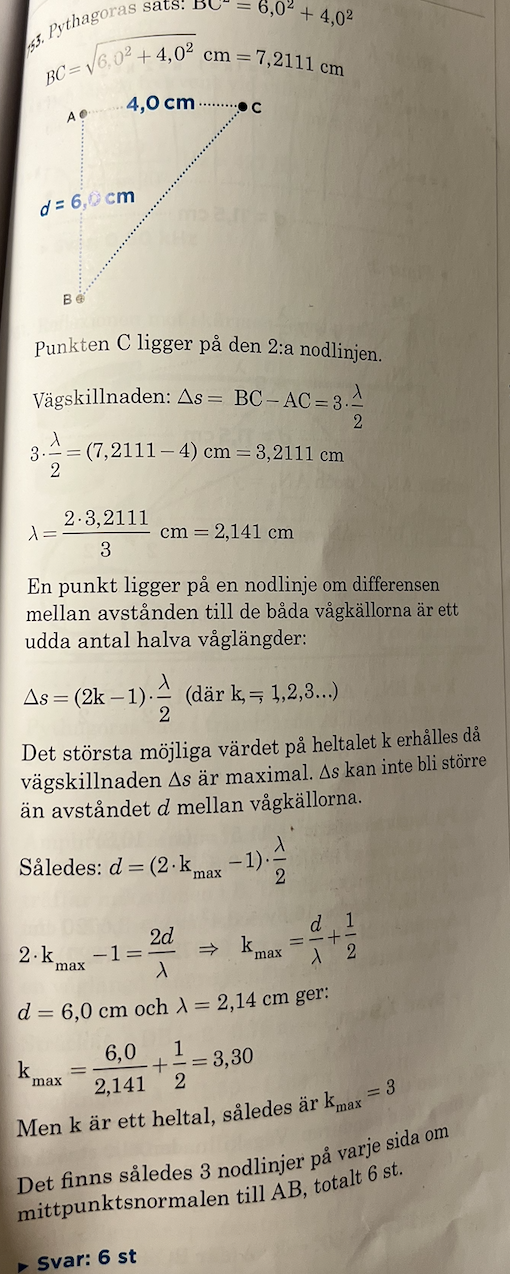 Andra uppgiften är helt annorlunda. Där är man inte alls intresserad av det totala antalet nodlinjer i hela vågtanken. På andra uppgiften är man intresserad av att hitta antalet nodlinjer i ett begränsat område av vågtanken, mellan punkten C och punkten D. Men i området mellan C och D är vägarna till källorna långt ifrån parallella. Därför måste man använda Pythagoras där.