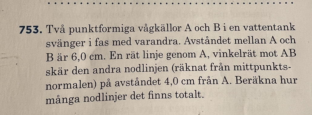 Två punktformiga vågkällor A och B svänger i fas. Avståndet AB är 4,0 m. Genom vågkälla A dras en linje L vinkelrätt mot AB. Om man från A förflyttar sig längs L finner man en första nodlinje på avståndet 0,27 m från A. Om man fortsätter längs L i samma riktning når man först en punkt Q där vågorna från A och B förstärker varandra maximalt, därefter korsar man fem ytterligare nodlinjer. Inga fler nodlinjer finns utefter L.