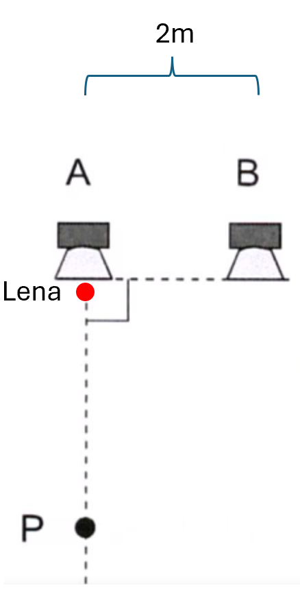 Den kortaste vägskillnaden till högtalarna blir när Lena förflyttar sig längs linjen så långt bort som möjligt från högtalare A, eftersom "kateten" Lena-A kommer att närma sig längden på "hypotenusan" Lena-B.