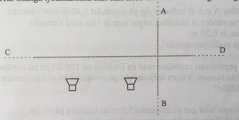 En person som går längs linjen AB i figuren kan höra totalt 10 st ljudmaxima.