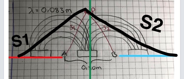 Låt oss från början konsatera för oss själva att antalet nodlinjer N kommer att bero av såväl källornas avstånd (40 cm) som vågens våglängd (i det här fallet 8 cm) och om vi har kort våglängd så får vi många nodlinjer och om våglängden är lång så får vi få nodlinjer så N bör öka om minskar