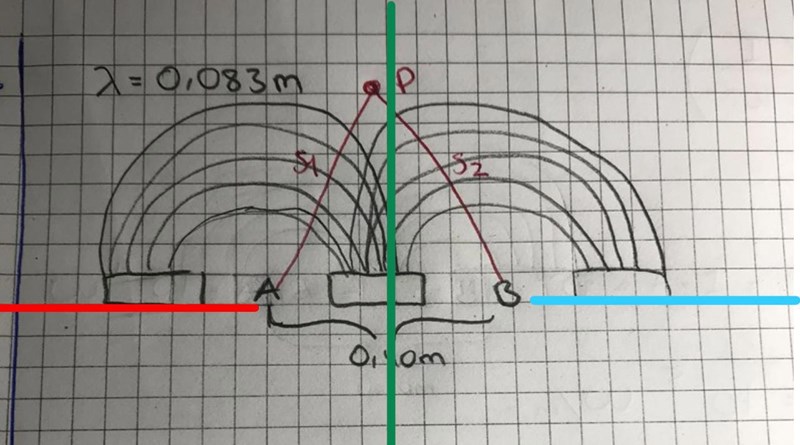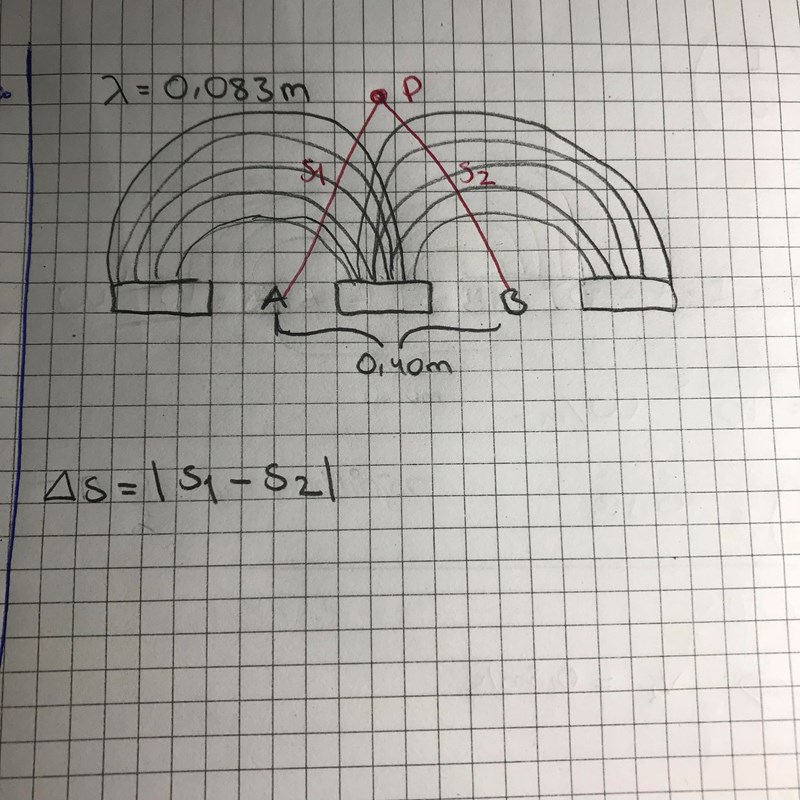 Två vågkällor A och B befinner sig på avståndet 0,40m ifrån varandra. Vågkällorna sänder ut cirkulära vattenvågor med våglängden 8,3 cm. Hur många nodlinjer uppstår om vågorna sänder ut i fas med varandra?