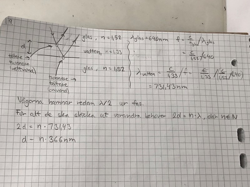 Mellan två vågräta glasplattor (n=1,52) finns ett tunt skikt vatten (n=1,33). Ljus med våglängden 640nm riktas nästan lodrätt uppifrån mot glasplattorna. Beräkna tre tjocklekar på vattenskiktet som för att ljuset släcks ut.