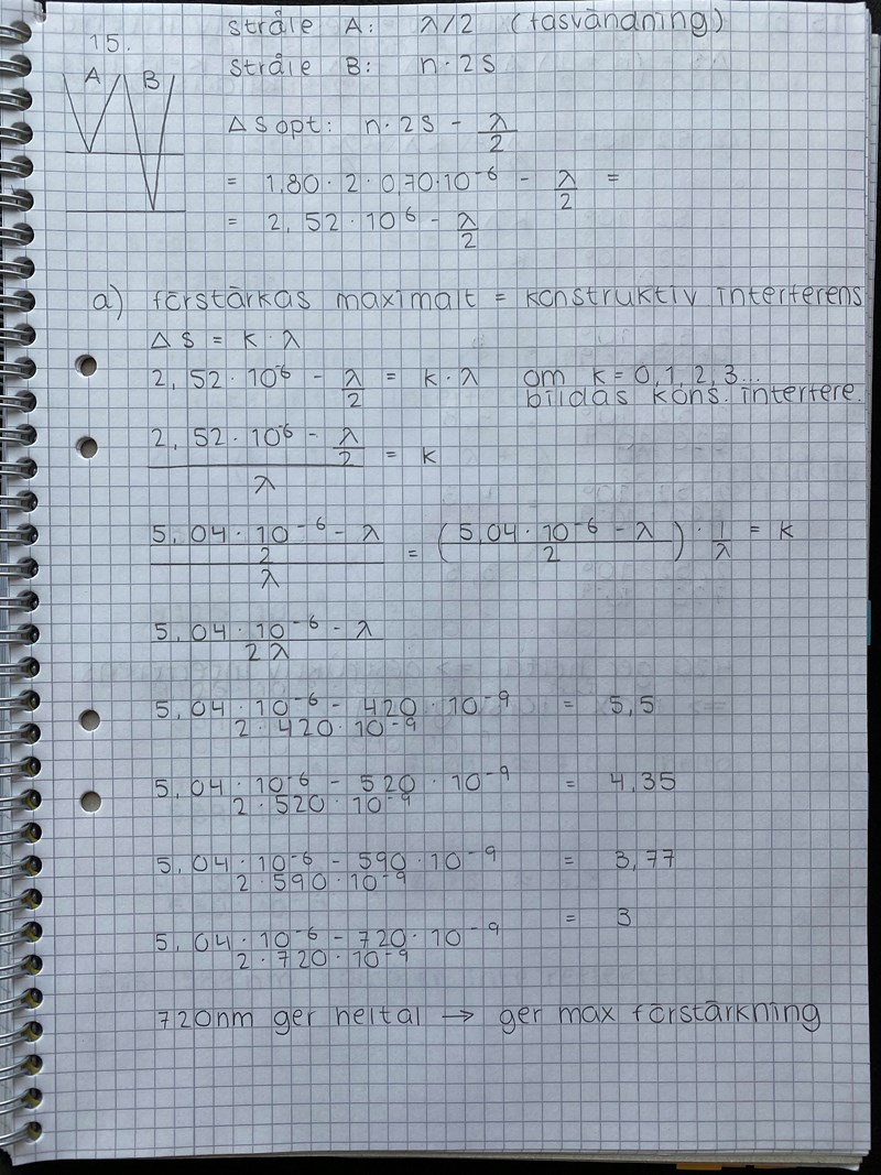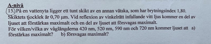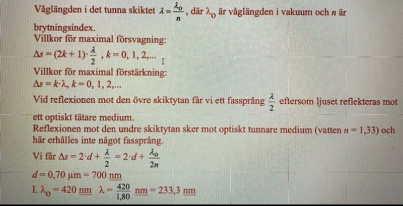 Uppgiften är ovanstående. Jag och lösningsförslaget beräknar uppgiften olika och det får mig att fundera lite. Min beräkning utgår från att våglängden är samma i luft som i skiktet. I verkligen är det ju inte det eftersom hastigheten är annan och frekvens och våglängd ändras då. Dock blir min beräkning lika som lösningsförslaget som läraren gjort. Dessutom räknar de i fysikboken på samma vis som jag, dvs bortser från ändringen av våglängden. Varför kan man göra som jag gör?