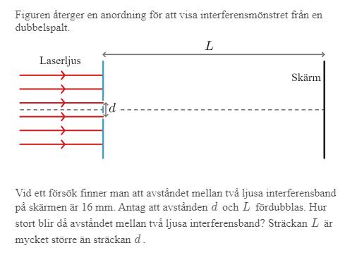 Som uppgiften säger: "Avståndet mellan två ljusa interferensband på skärmen är 16 mm."