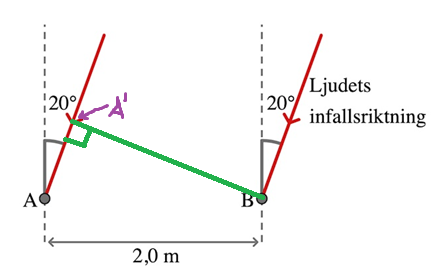 Jag har markerat en punkt A' där ljudet kommer att komma samtidigt (i samma fas) från ljudkällan. Det är alltså lika långt till A' som till B.