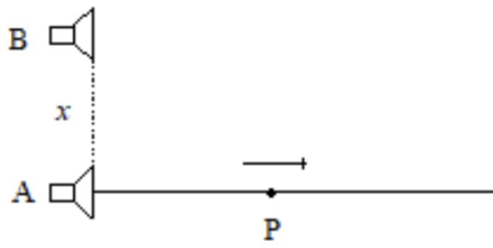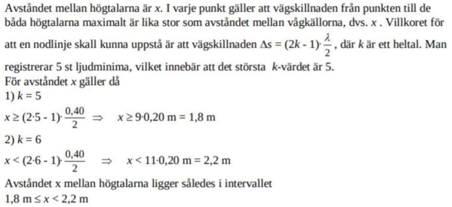 Frågan är: Två små högtalare, A och B, är anslutna till samma tongenerator. Denna är inställd på frekvensen 0,85 kHz. En person P befinner sig från början strax intill högtalare A. P avlägsnar sig från de båda högtalarna längs en linje vinkelrät mot linjen AB. Under förflyttningen upplever P variationer i ljudintensiteten från de båda högtalarna. Han uppfattar totalt 5 ljudminima under sin förflyttning. Ljudhastigheten var 340 m/s.