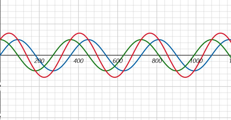 om högtalaren till vänster sänder ut den blå vågen och högtalaren till höger sänder ut den gröna blir summan av de två den röda signalen. Där den röda skär x-axeln har vi ljudminima och där den röda är max eller min har vi ljudmax.