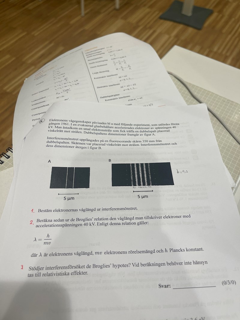kan någon hjälpa mig lösa första uppgiften i den här frågan. Vet inte riktigt vart jag ska börja. Jag kollade i formelbladet och hittade de här formlerna för interferens med dubbelspalt: