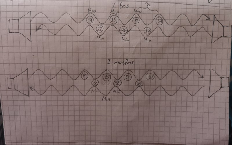 Yngve skrev:Om ljudvågorna sänds ut i motfas så blir det max då vägskillnaden är (2n+1)*våglängd/2 eftersom det är i de punkterna som vågtopp möter vågtopp och vågdal möter vågdal.