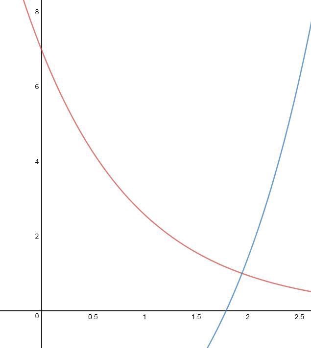 Kurvan y=7e^-x begränsar tillsammans med y-axeln och kurvan y=e^x-6 ett område. Bestäm dess area och svara exakt.