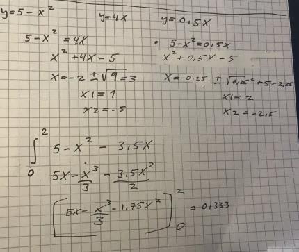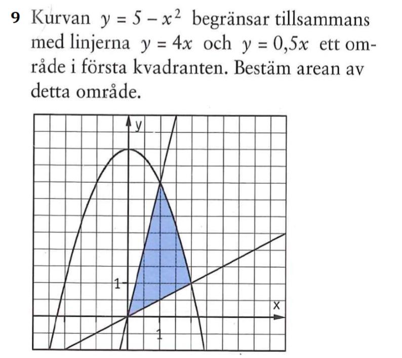 - .I intervallet [1, 2] är det y = 5-x2 som är övre funktionen och y = 0,5x som är undre funktionen.