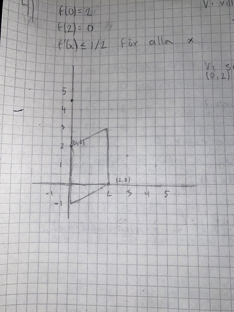 Rita nu en graf mellan x = 0 och x = 2 som ger dig så stort värde som möjligt på integralen, det motsvarar att grafen ligger så högt ovanför x-axeln som möjligt så länge som möjligt. Tänk då på att f'(x) endast är uppåt begränsad i och med f'(x) \leq 1/2, vilket betyder att den kan vara hur liten som helst, dvs grafen kan luta hur brant som helst neråt.