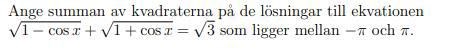 1-cosx+1+cosx=31-cosx+2(12-cos2x)+1+cosx=3                   // kvadrerar2+2(12-cos2x)=32+2((sin2x+cos2x)-cos2x)=3                            // trig ettan2+2sin2x=3sin2x=12   sinx=12                                        // fick sinx ensamtx1=π6   x21=(π6)2=π236                              // genom logiskt tänkade kom jag fram till att det endast bör finnas 2st lösningar innom intervallet.x2=5π6 x22=(5π6)2=25π236xsumma=x1+x2=π236+25π236=26π236=2×13π23×2×6=13π23×6=13π218  // svar i facit: 13π29