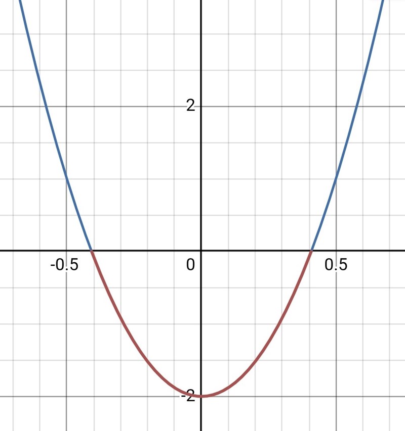 Det betyder att du ska lösa olikheterna 12x2-2 > 0 respektive 12x2-2 < 0.