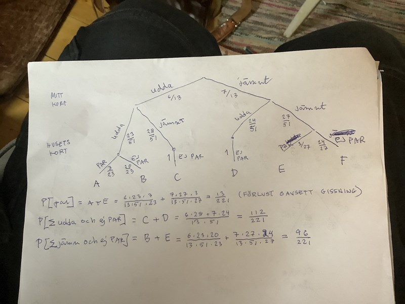 Fall 2: Sh att du får jämnt är 7/13. I så fall är sh att huset får jämnt av annan valör 24/51 och att det får udda 24/51.