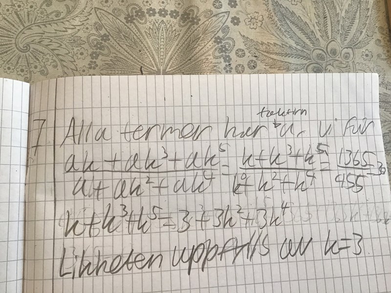 (Ekvation 2)/(Ekvation 1) ger nu ka1(1+k2+k4)a1(1+k2+k4)=1365455\frac{ka_1(1+k^2+k^4)}{a_1(1+k^2+k^4)}=\frac{1365}{455}, dvs k=3k=3