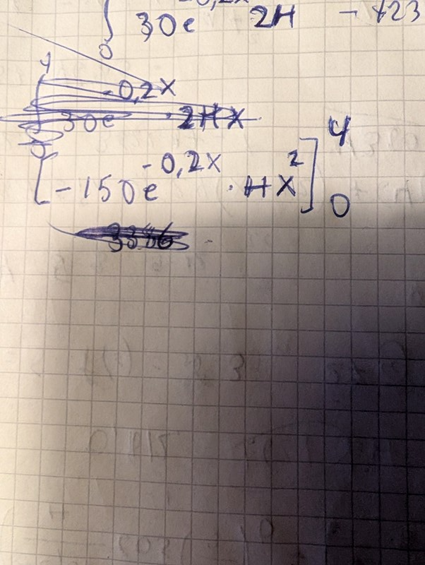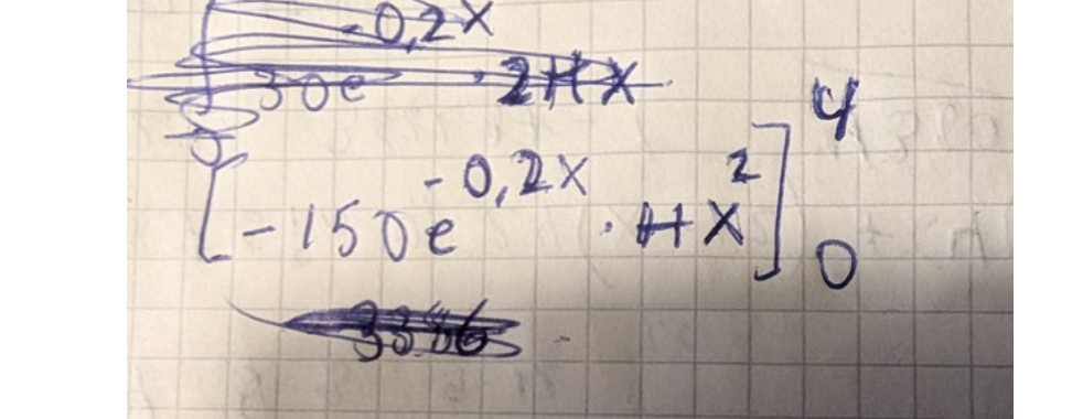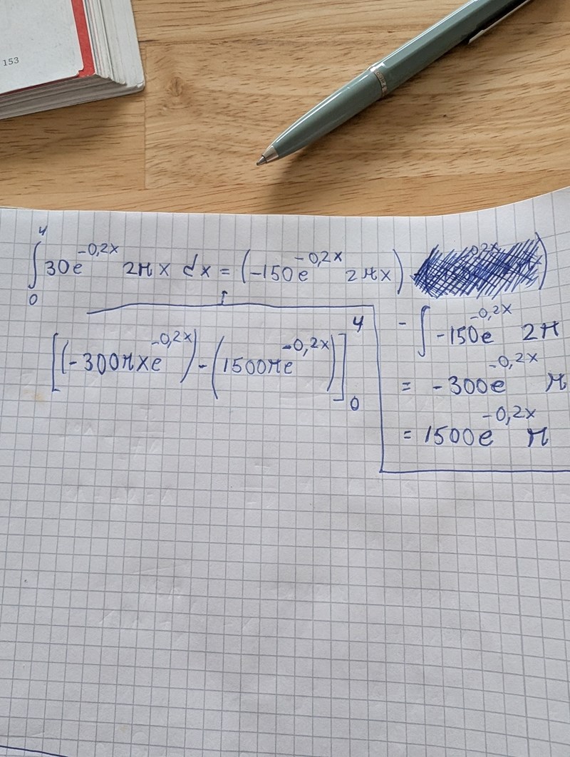 Såhär blev det nu, gjorde om fr.o.m steget när jag flyttade ut e^(-0.2x) uttrycket på papperet nedan.
