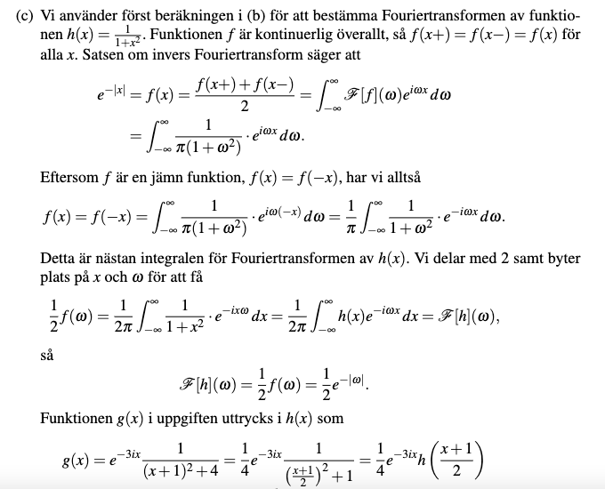 Uppgift c) handlar om att beräkna Fouriertransformen av ett uttryck som blir lite tråkigt att integrera. Dessutom är man ofta lat av sig och vill återanvända det man gjort tidigare om det går snabbare och enklare. Därför använder man i facit resultatet från den tidigare beräkningen samt lite specialregler.