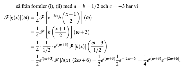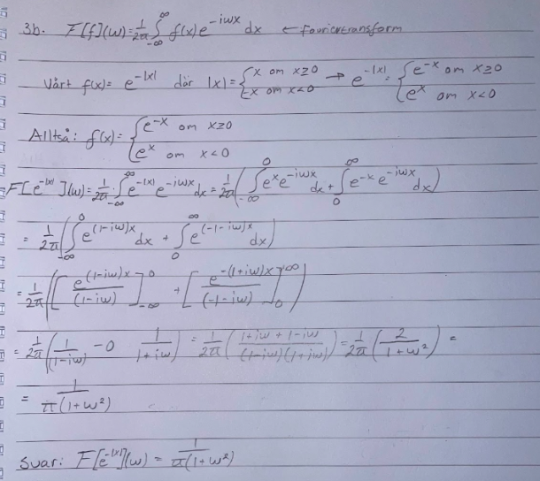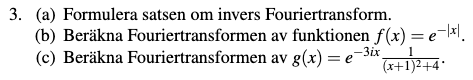 I uppgift b) har du alltså embryot till en egen formelsamling, med en funktion och dess Fouriertransform. När man har en Fouriertransform till en funktion är det enkelt att i sin tur hitta denna funktions  transformation (som om transformen hade varit en funktion i xx) och facit visar hur man kan göra det med manipulation.