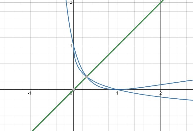 Jag kan se i ett koordinatsystem att den inte är inverterbar efter x=1, för den speglar inte längre i y=x då. Men hur ska jag komma fram till det algebraiskt?