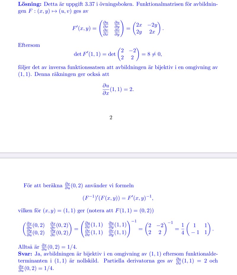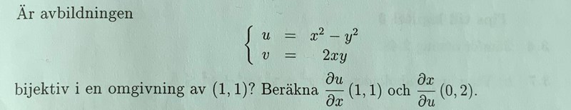Micimacko skrev:Om du stoppar in (1,1) i u och v så ser de ut att bli 0 och 2, så jag tror inte du ska bryta ut och derivera utan leta upp någon sats så du slipper det. Bijektiv betyder ju att man kan hoppa fram och tillbaka, så det har antagligen med den första derivatan att göra på något sätt.