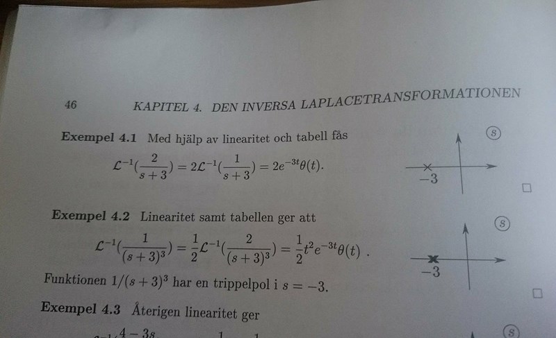 Uppgift 4.1, man ska ta reda på den inversa laplacetransformationen med hjälp av bilden till höger. Svaret står till vänster om bilden, och jag undrar vart 2:an i täljaren kommer ifrån? Hur läser jag av det med hjälp av bilden?