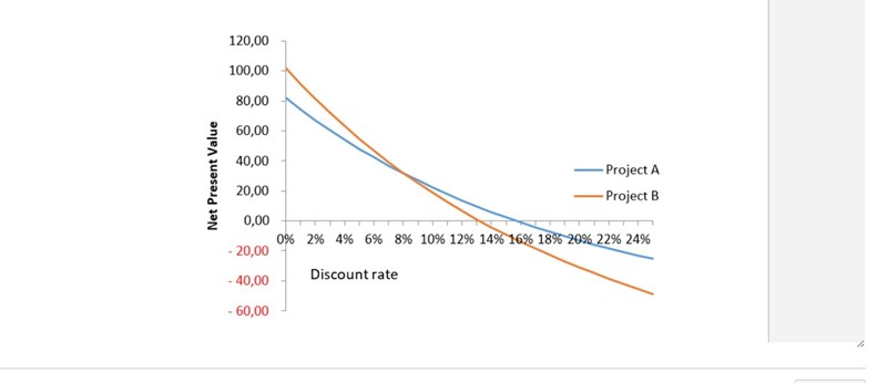 det står vilket project tar du om discount rate är 4,5%, så kollar man på grafen när den är 4,5% och ser att project b har högre npv