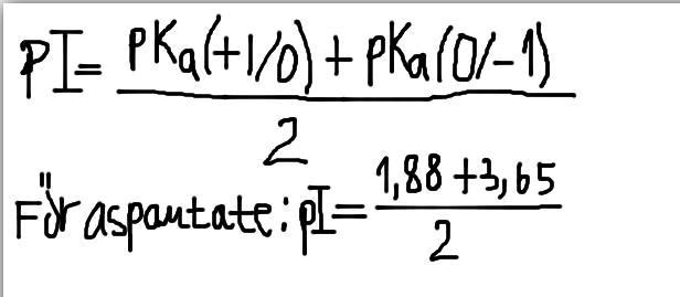 Enligt engelska Wikipedia är pKa för asparaginsyra 3,9 men det stämmer inte med något av värdena i din formel. Så jag vet inte vad det är man sysslar med. pI för en aminosyra som inte har sur eller basisk sidokedja verkar vara ganska lättbegripligt, men det här har jag inte någon aning om.