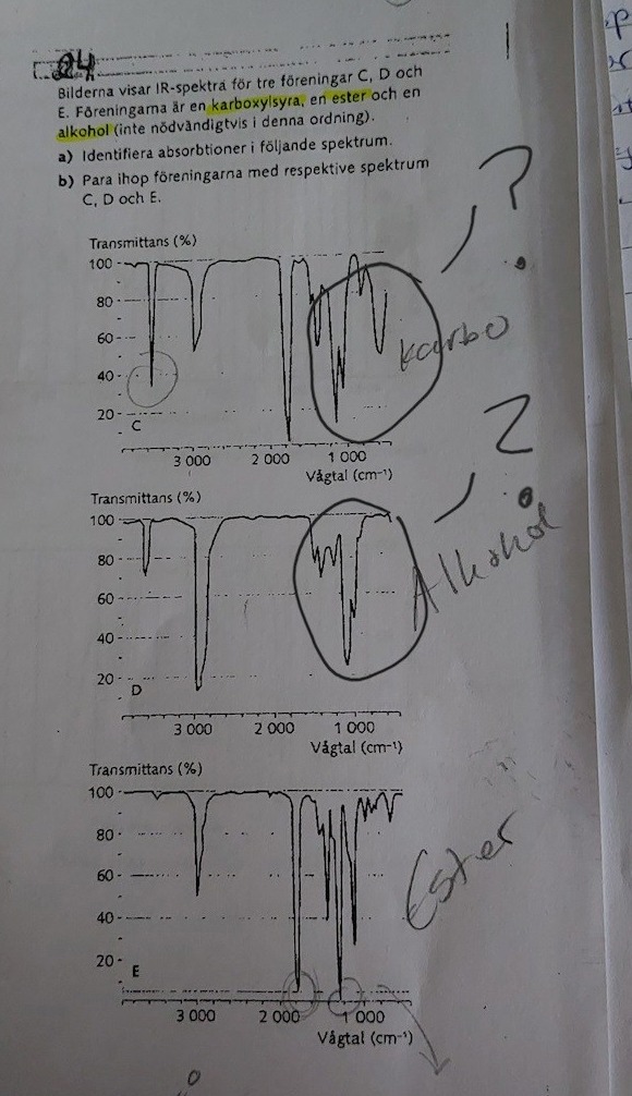 Hej! Jag löste nyss denna uppgift och fått ett svar i denna ordning: Karboxylsyra, alkohol, ester. Det finns dock några dalar jag varken använt mig av eller kunnat identifiera. Jag undrar om det är normalt att inte alla tas hänsyn till? Måste alla absorptioner identifieras eller räcker det med mitt svar?