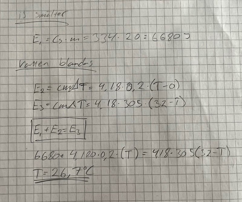 Fråga: 20 g nollgradig is blandas med 305 g vatten med temperaturen 32 grader. Vad blir sluttemperaturen?